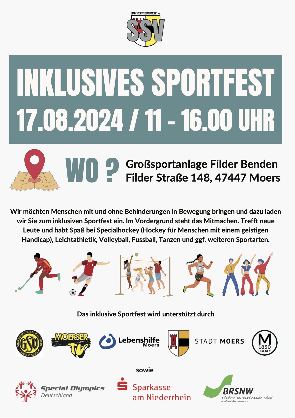 Am 17.08.2024 findet erstmalig das 1. Inklusive Sportfest statt. Veranstaltet wird das Sportfest vom Stadtsportverband Moers e.V.. Menschen mit und ohne Behinderung sollen an dem Tag gemeinsam in Bewegung gebracht werden. Im Vordergrund steht das Mitmachen, das Treffen neuer Leute und der Spaß bei Specialhockey (Hockey für Menschen mit einem geistigen Handicap), Leichtathletik, Volleyball, Fußball, Tanzen und ggf. weiteren Sportarten. Für das leibliche Wohl ist gesorgt. Die Veranstaltung wird von Gebärdensprachdolmetscherinnen begeleitet.